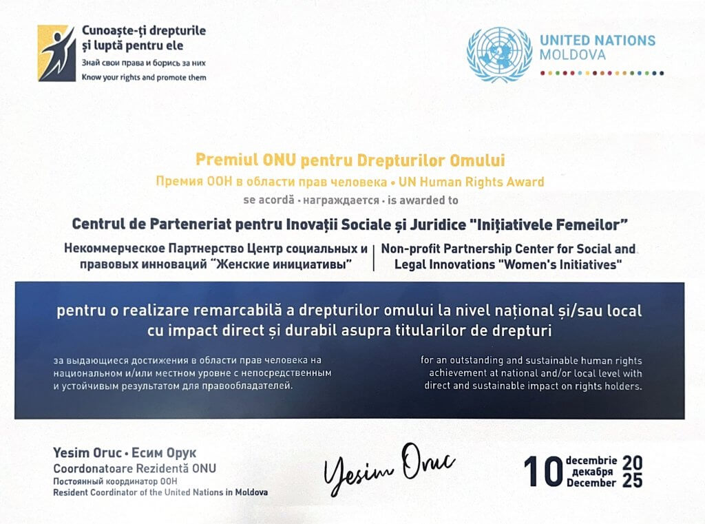 Мы очень благодарны, что наши усилия и наша работа в области защиты прав человека, особенно тех, кто пережил домашнее насилие, кейсы торговли людьми или находится в трудной жизненной ситуации, были отмечены на таком высоком уровне. Благодаря поддержке партнеров и доноров мы смогли расширить спектр услуг и вносить устойчивый вклад в укрепление прав человека в нашем сообществе. Мы благодарим наших партнеров и команду за преданность делу, готовность прийти на помощь и профессионализм. «Женские инициативы» продолжают действовать там, где помощь нужна больше всего, искать новые решения и оставаться рядом с теми, кто в этом нуждается.