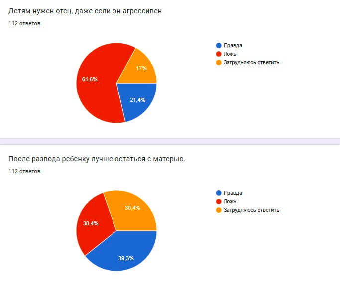 В 2025 году мы проводили небольшой опрос о стереотипах о домашнем насилии, и его итоги решили подвести в финале «16 дней». Результаты достаточно интересные: например, более 61% участников считают, что детям не нужен отец, если он агрессивен, а вот утверждение о том, что после развода ребенку лучше остаться с матерью беспрекословно поддержали лишь 39%.