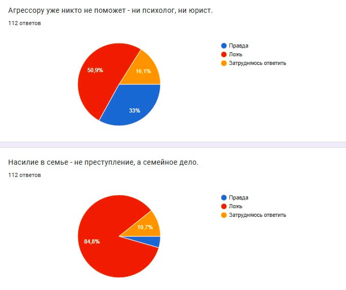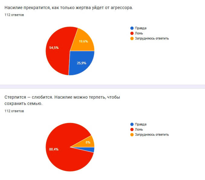 57% полагают, что агрессором чаще может быть мужчина, а стеротип «сама виновата» не поддержали 7754% справедливо полагают, что насилие не прекратится, когда жертва уйдет от агрессора. Еще один стереотип «стерпится – слюбится» опровергли 88% респондентов.